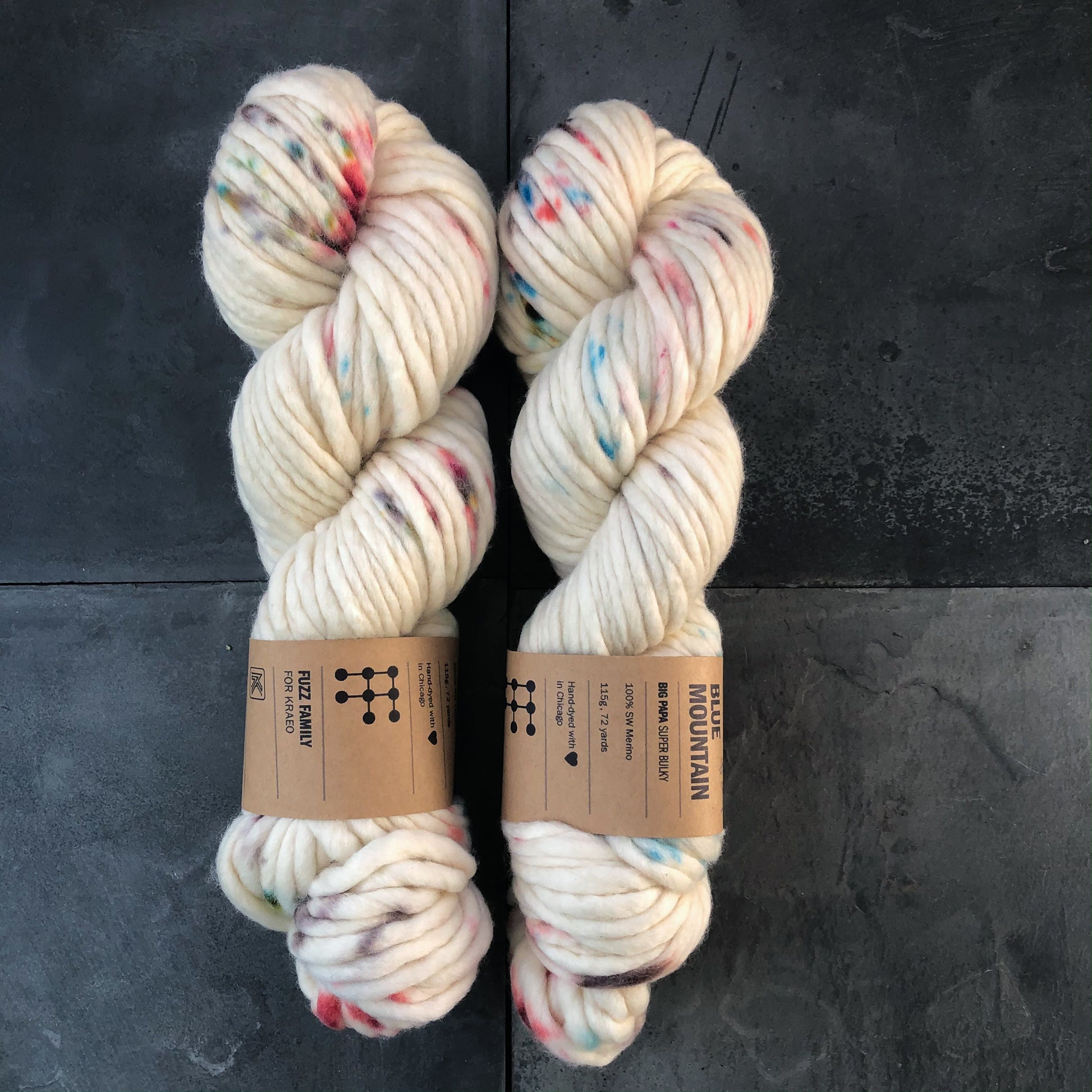 Fuzz Family yarn is dyed in small batches of 2-4 skeins per lot. If using more than one skein per color way, its highly recommended that you alternate skeins every 3-5 rows.