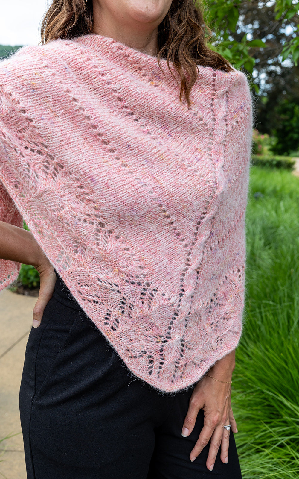 This triangular shawl has two sizes to choose from depending on your preferred way to wear. The eyelets and cable spine keep you interested while working your shawl body. The border is finished with a beautiful scallop shaped lace panel.