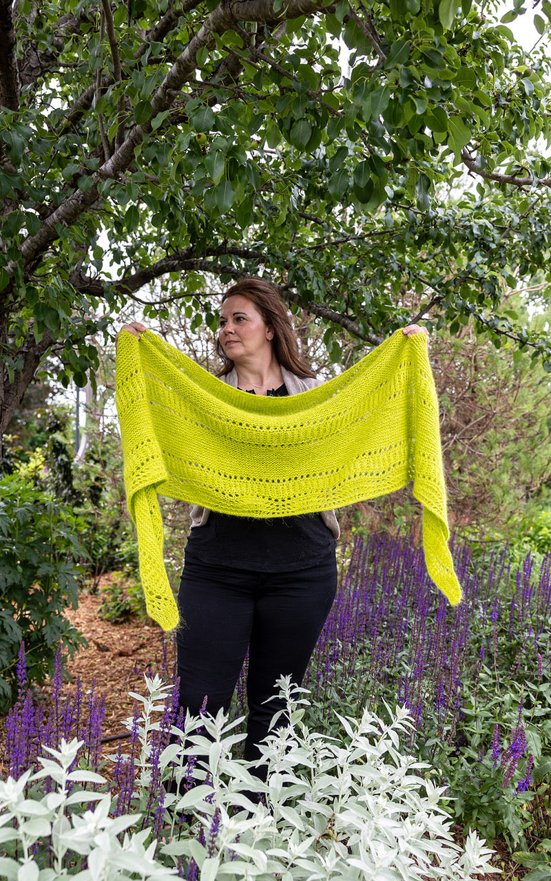 The Midori Dreams Shawl is one of the new designs in my Summer Shawls & Sips collection, releasing throughout the Summer of 2024. Midori Dreams is knit holding fingering and Suri lace together. It is so very soft and light!