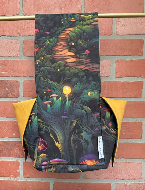 This is the perfect on the go project bag. You can carry your yarn in it and knit or crochet while walking or chasing your kids like I do. If you have to move fast just tie it up and all of your things stay safe inside.