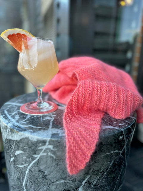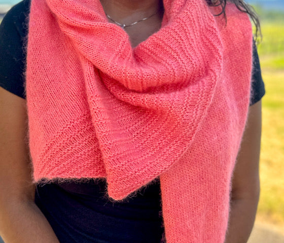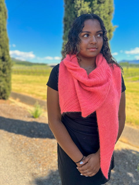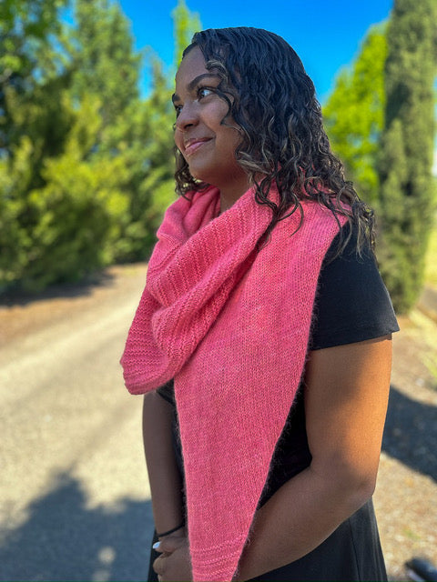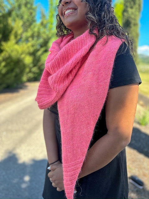 The Paloma Shawl is knit holding fingering and Suri lace together. It is so very soft! It’s a different shape that is part sideways triangle with a little mix of an asymmetrical design, too. This is a wonderful beginner knit project with garter, stockinette, increases and decreases.